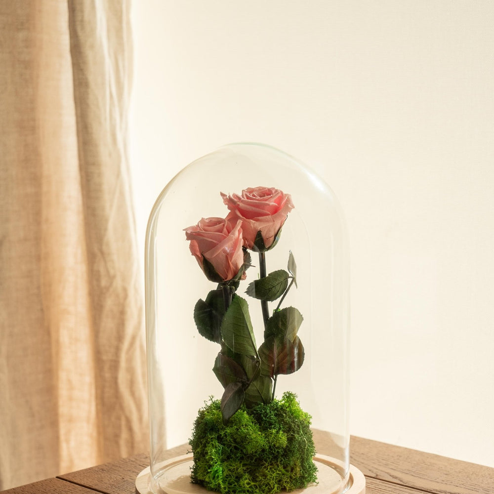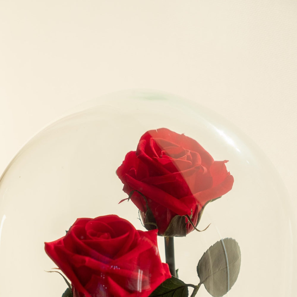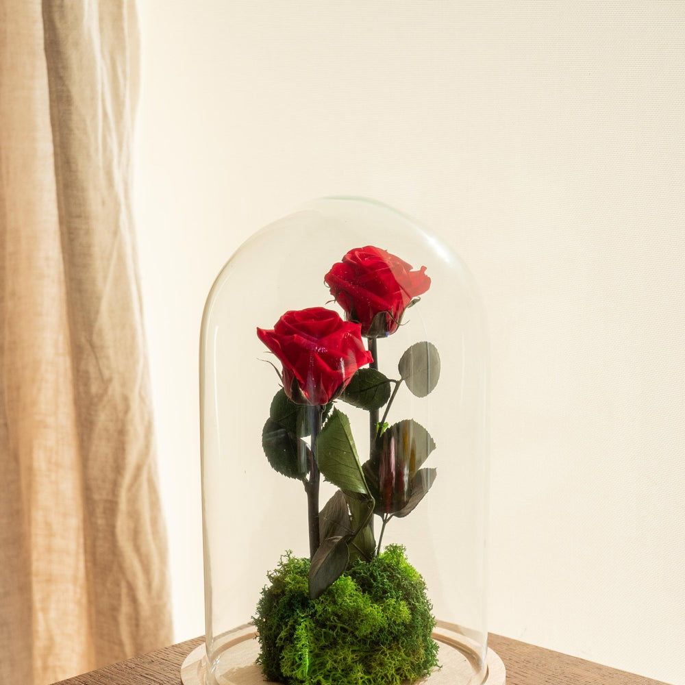 Il s'agit de deux Roses naturelles proposées avec sa cloche pour la mettre en valeur mais également la protéger de la poussière.