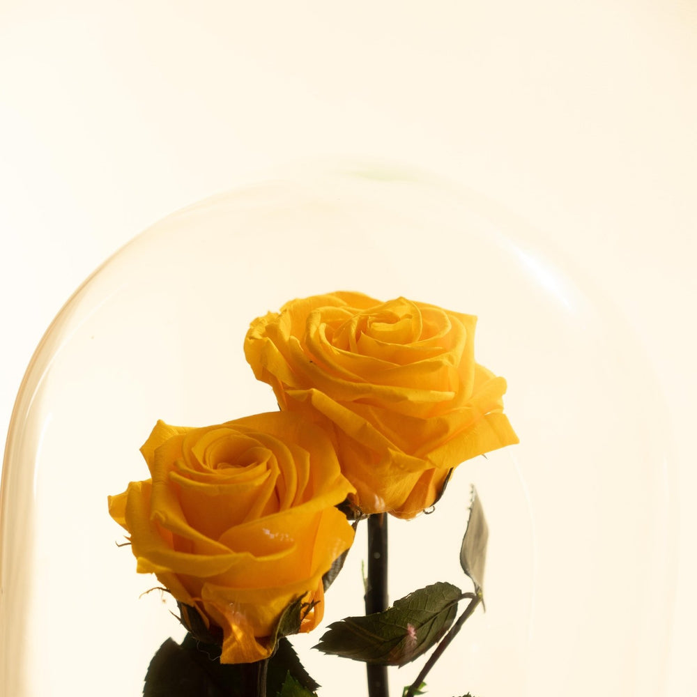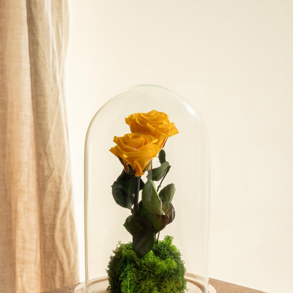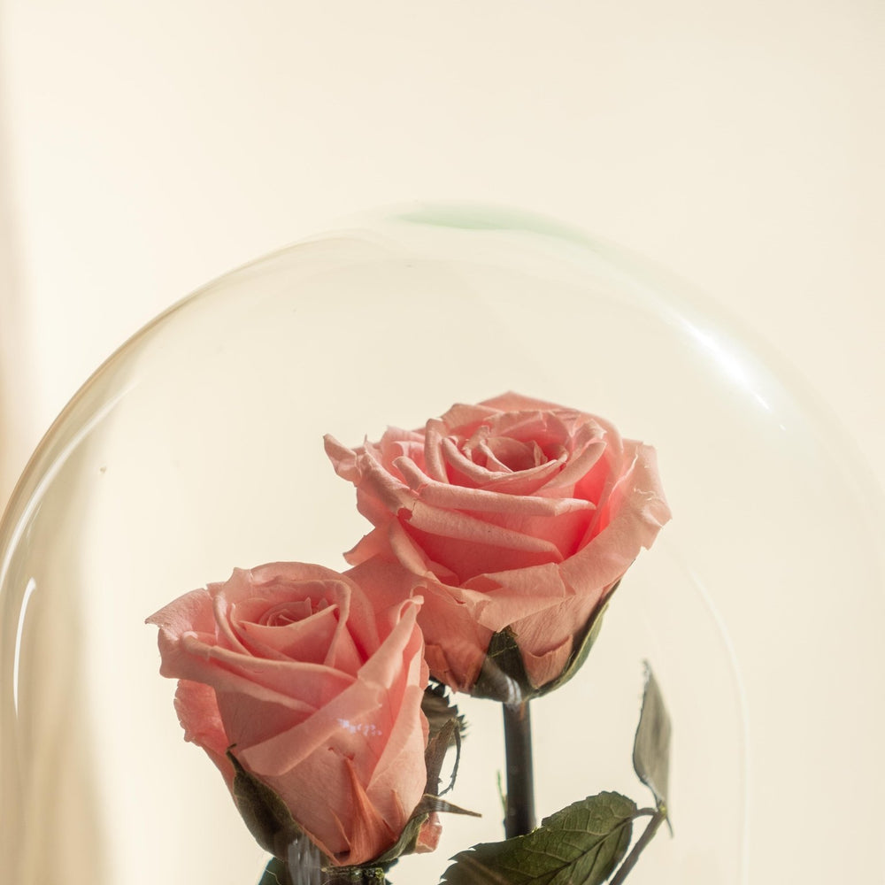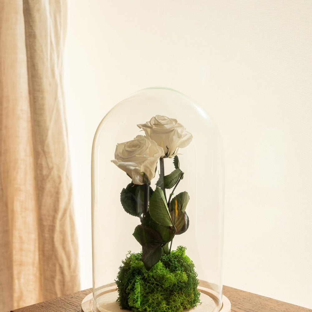 Il s'agit de deux Roses naturelles proposées avec sa cloche pour la mettre en valeur mais également la protéger de la poussière.