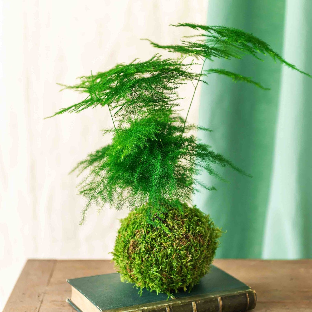 „Koke“ tauchte in den 1990er Jahren in Japan auf und bedeutet Schaum, „dama“, eine Kugel, eine Kugel, aber auch etwas Kostbares. Es besteht aus einer mit nährstoffreichem Lehmsubstrat gefüllten Mooskugel, auf der hier eine hübsche Asparagus plumosus-Pflanze ruht.