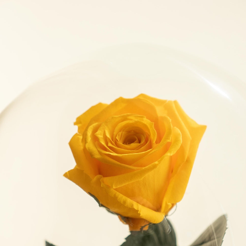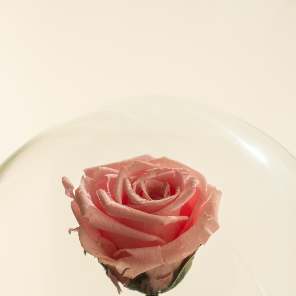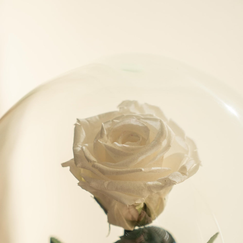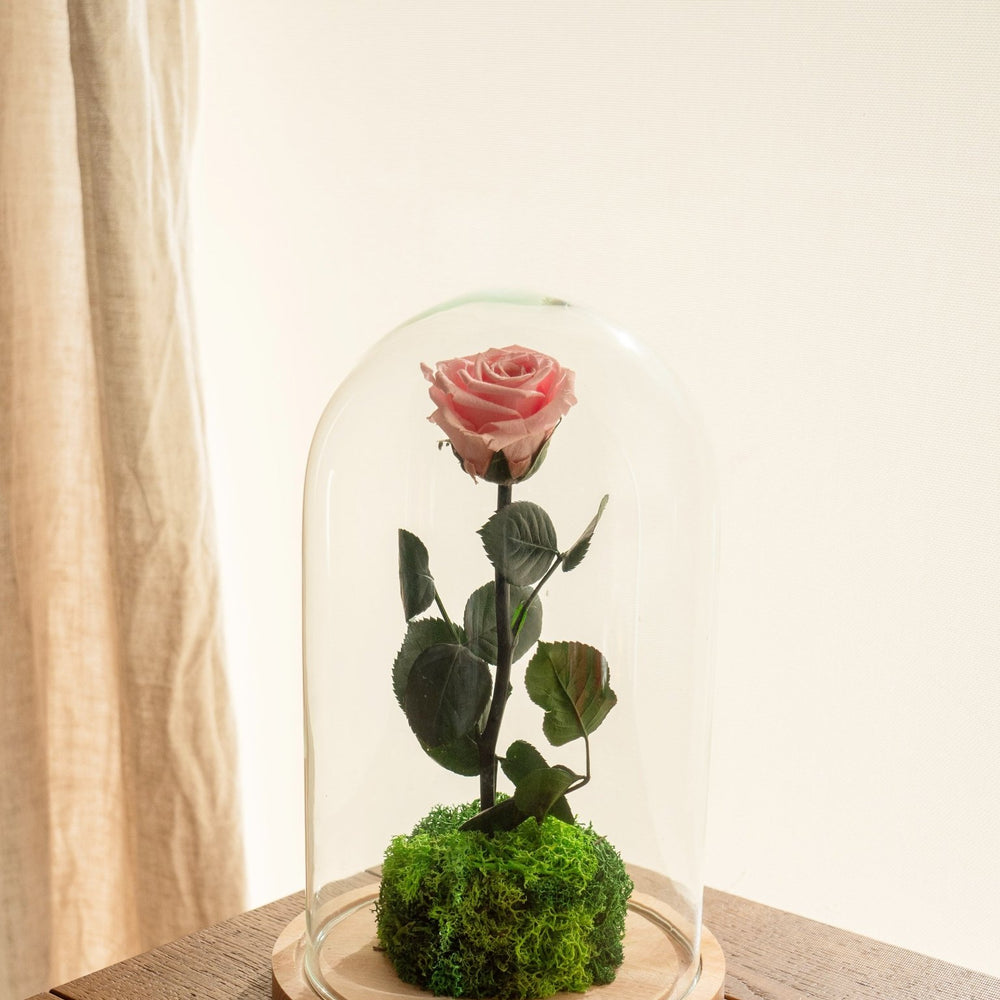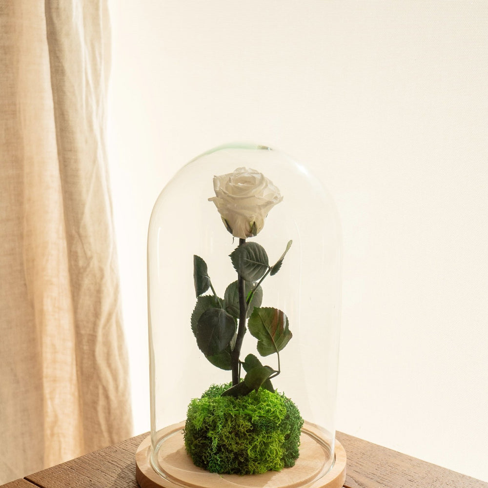 Il s'agit d'une Rose de jardin naturelle proposée avec sa cloche pour la mettre en valeur mais également la protéger de la poussière.