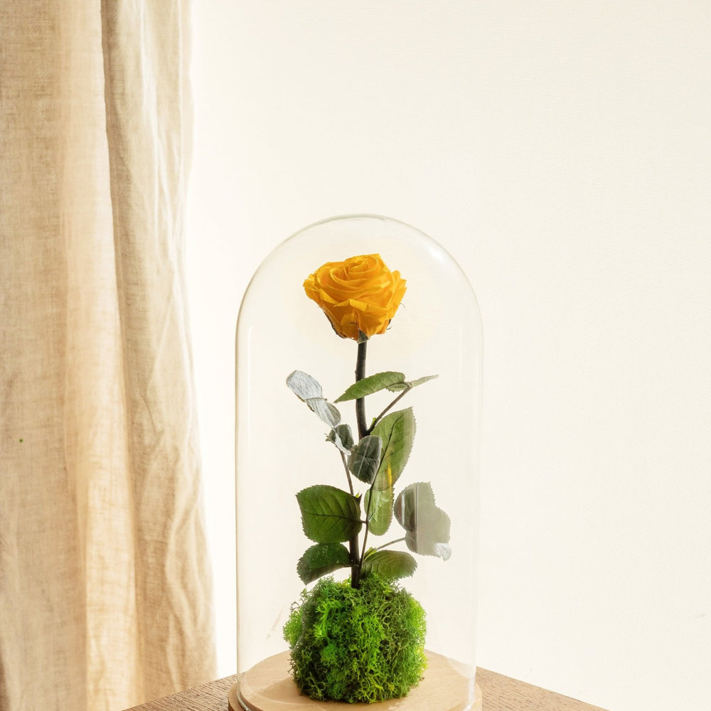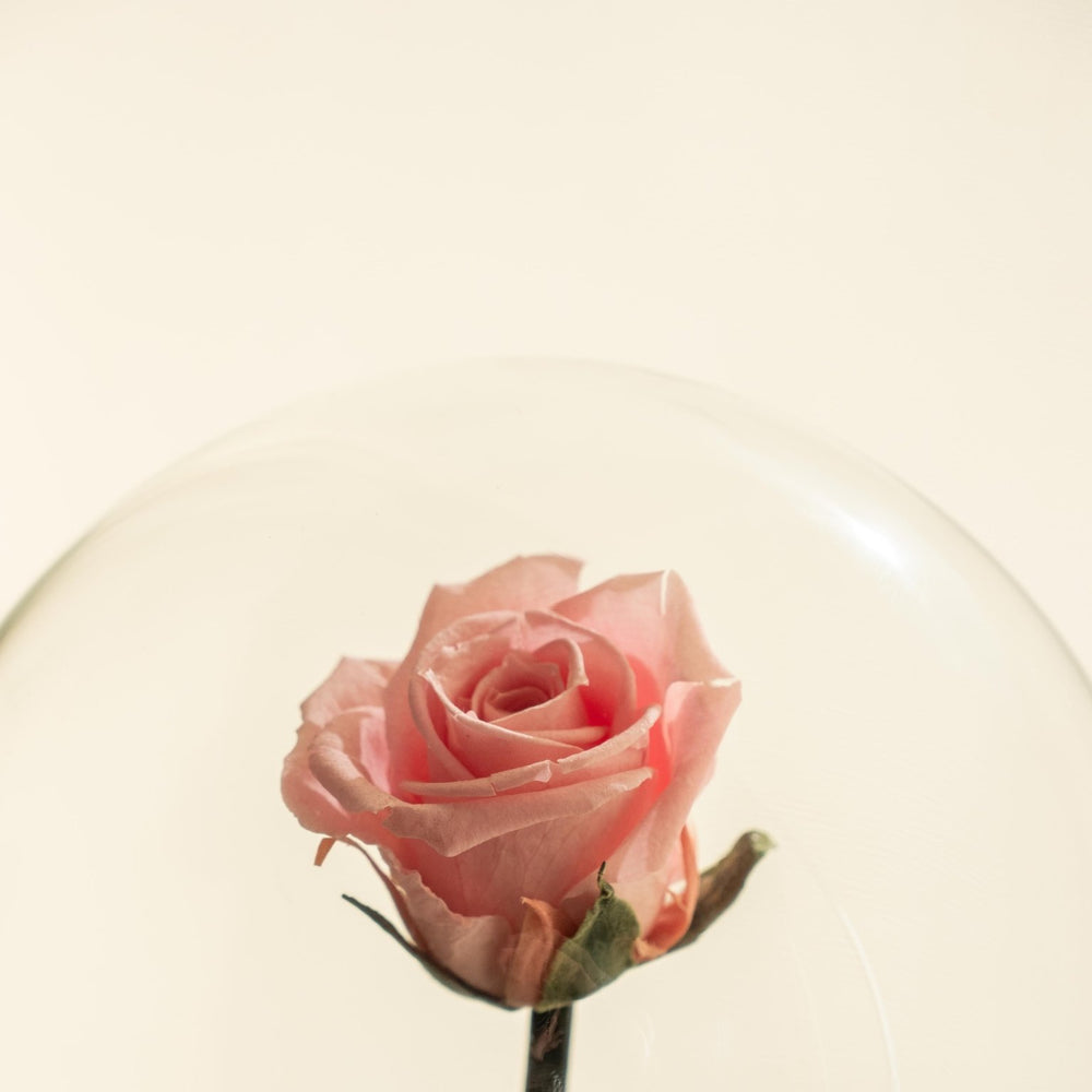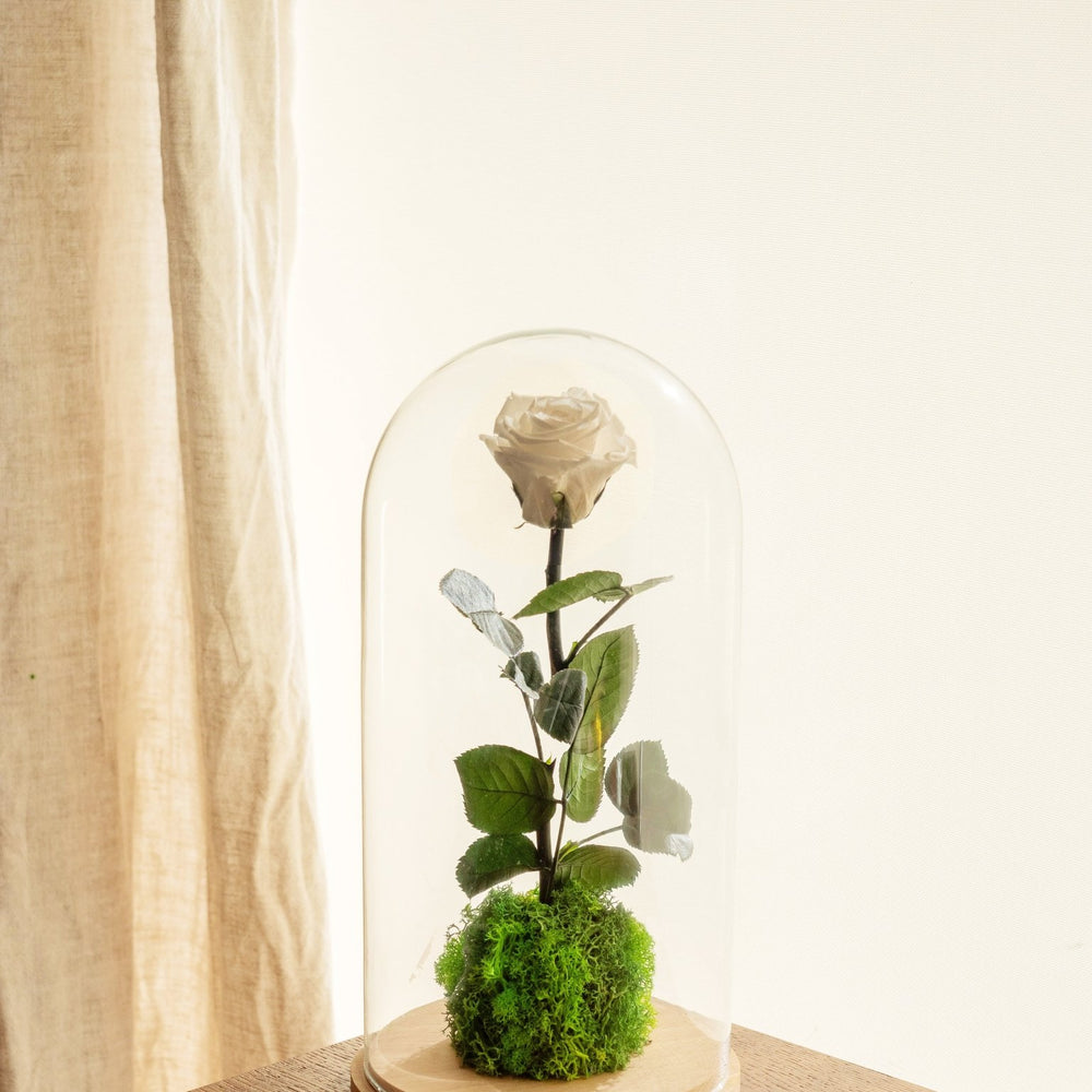 Il s'agit d'une Rose de jardin naturelle proposée avec sa cloche pour la mettre en valeur mais également la protéger de la poussière.
