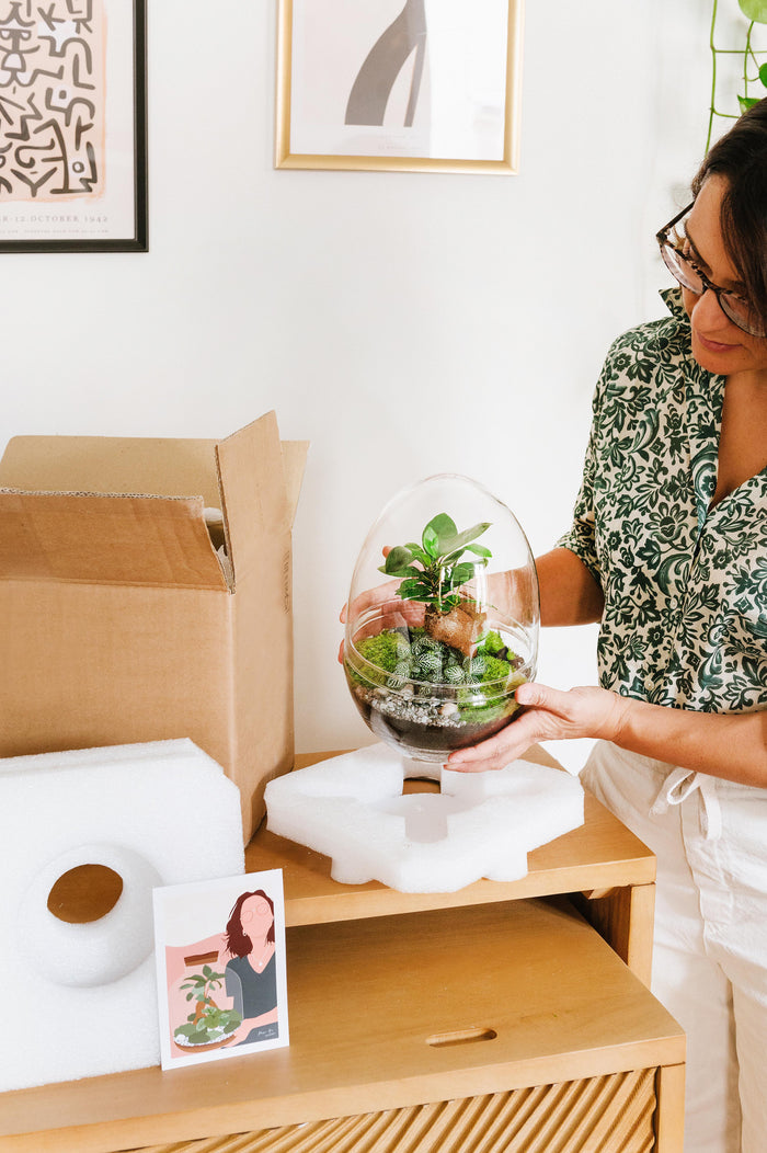 Nous avons développé un emballage spécifique en plastique recyclé qui s'adapte à chaque plante, terrarium, cache-pot ou kokedama. Forts de notre expérience en logistique et packaging, nous vous garantissons une réception sans encombre, comme si vous étiez venue la chercher à notre atelier.