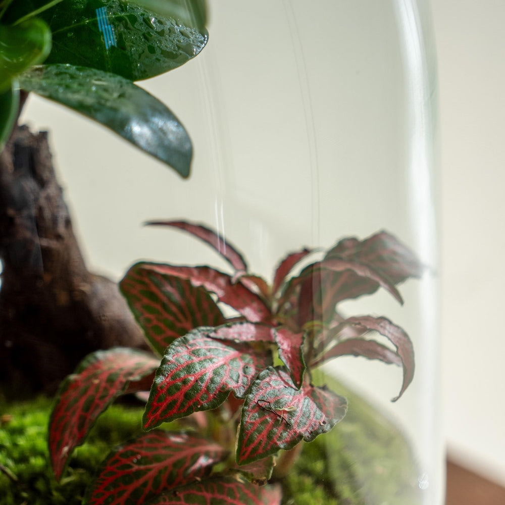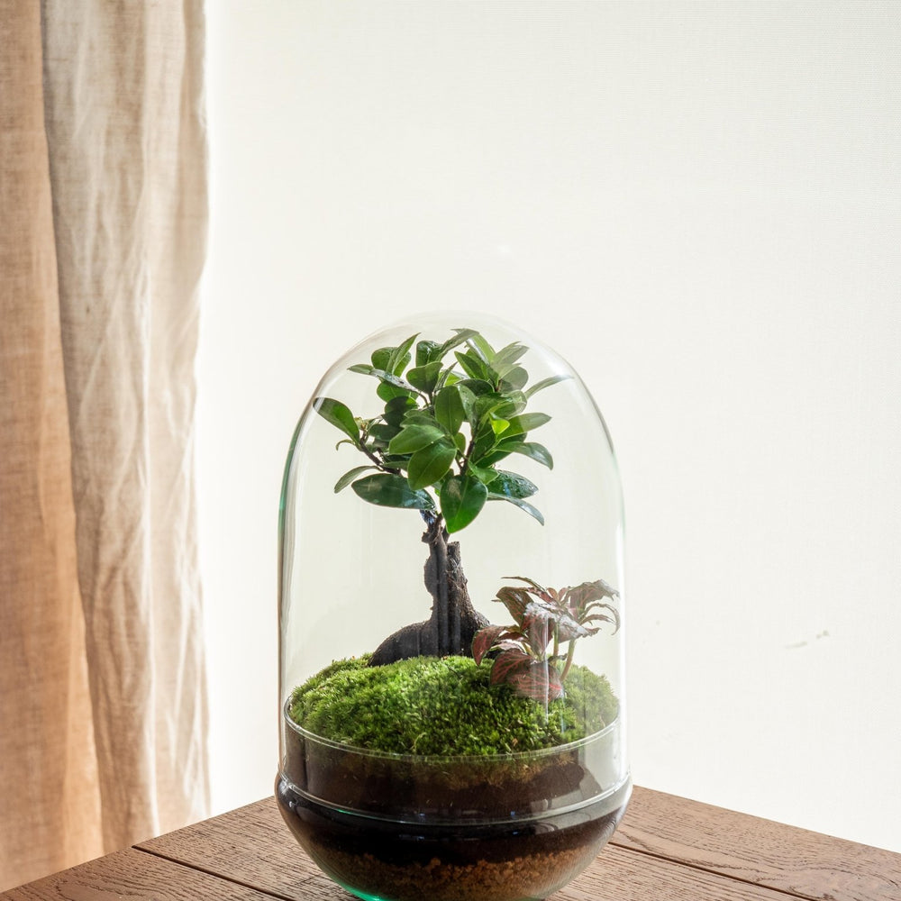 Samenstelling : Een glazen pot met een diameter van 18 cm en een hoogte van 30 cm, een ficus, een fittonia en een vrij unieke decoratie met natuurlijk mos en kleine steentjes zijn ook aanwezig.